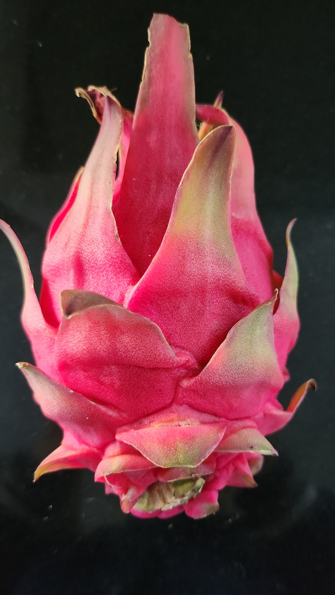 Fruit size is typically 1 to 2 lb, and the skin and the red of the skin is very unusual. Again it is one of the most stunning Dragon Fruits that we grow.